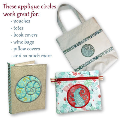 This large versatile set of 10 applique circles comes in two hoop sizes: designs for the 4x4 hoop come in various sizes up to 3.84” and designs for the 5x7 hoop are all 4.6” in diameter. Each circle is stitched with either one or two pieces of applique fabric and you can back the main applique piece with a lightweight fusible fleece/batting for some dimension and a trapunto effect.