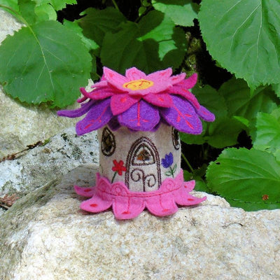 Fairy Houses! This unique embroidery set is part of the Enchanted Forest collection and features five different whimsical fairy houses which each fit an LED tea light to give the houses a magical glow. The height of the finished homes range from 3" to 5" tall and they are each completed in two hoopings: one hooping for the body and one hooping for the roof. They are created using the layering technique so almost all of the cutting is done after the design has stitched and is unhooped. They are then assembled using hot glue, dunked in hot water to dissolve some of the stabilizer, then fluff up the leaves, let them dry and they are finished.